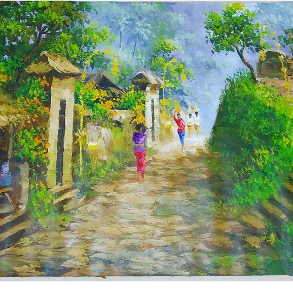 Lukisan pemandangan perkampungan di bali yang sangat indah.